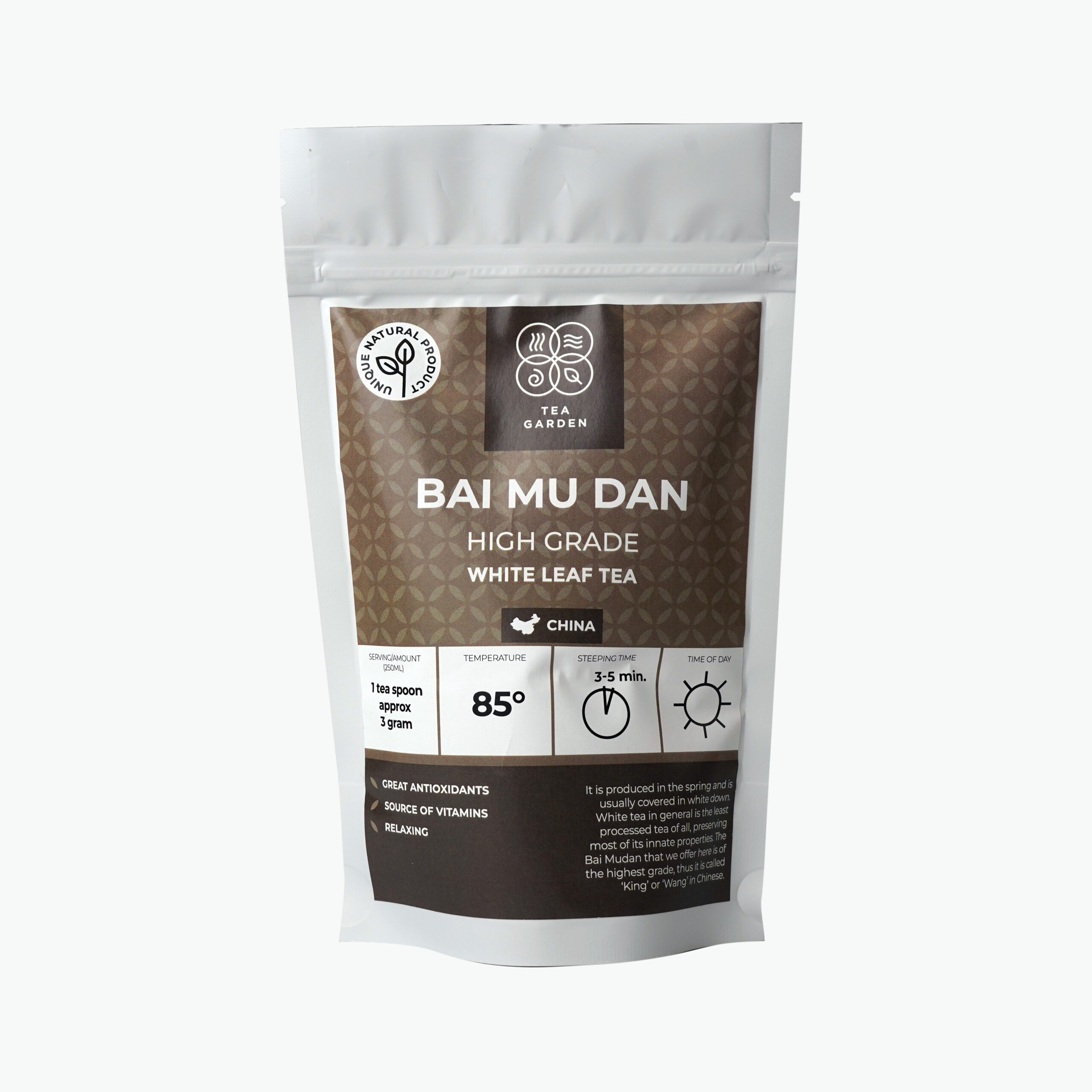 Bai Mu Dan tea is usually grown in the Fujian Province of China. White tea in general is the least processed tea of all, preserving most of its innate properties. The Bai Mu dan is known for its high proportion of anti-oxidants polyphenols and for its cooling effects.